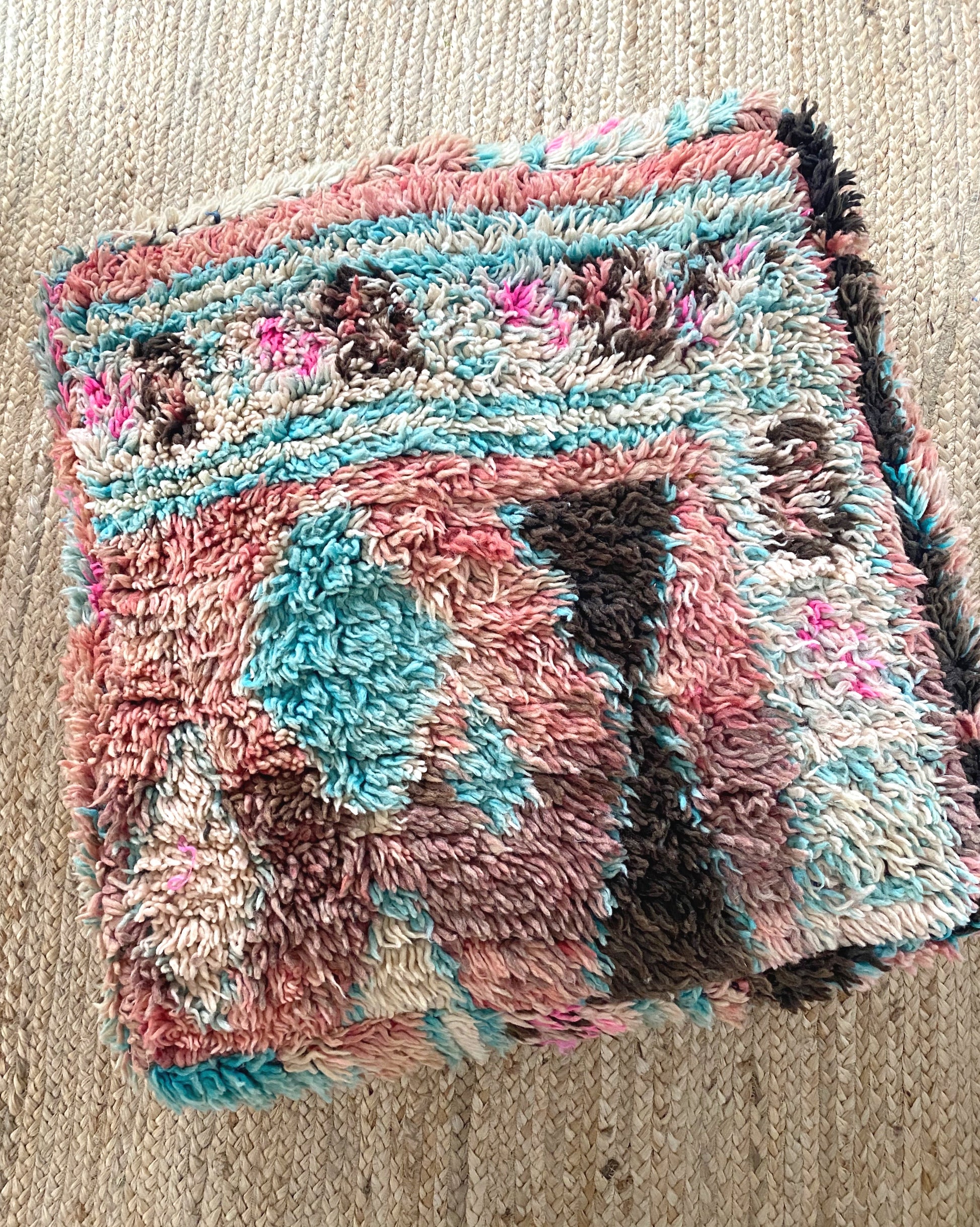Crafted by Moroccan artisans with locally sourced wool. This time honored act of recycling art is incredibly unique and we hope it never stops being passed down.